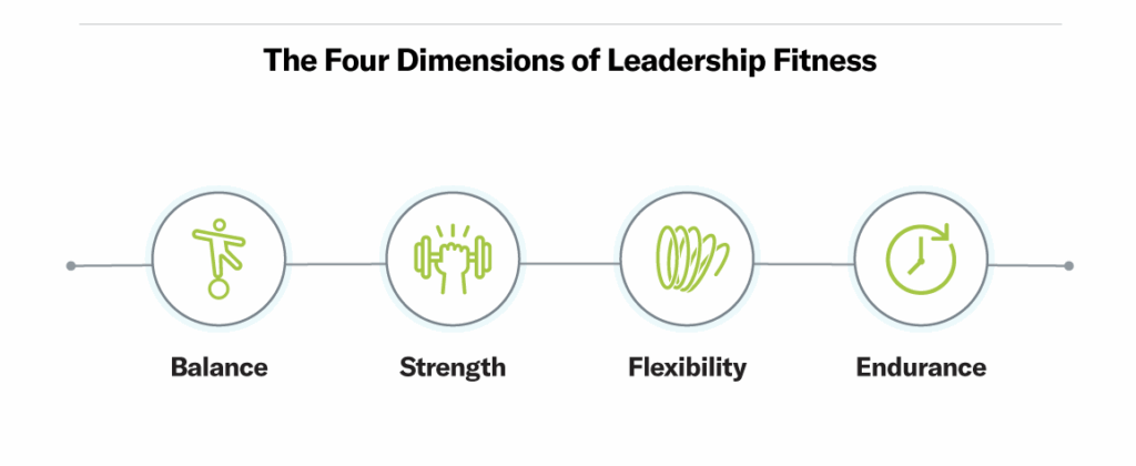 - We identified four capacities leaders must develop—what we call the four dimensions of Leadership Fitness: Balance, Strength, Flexibility, and Endurance.