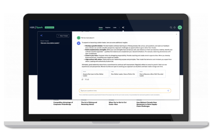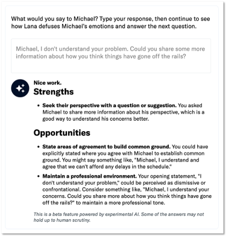 HBR Spark offers now six Leadership Labs augmented with AI-provided feedback. Learners can now take on the role of a character in a scenario and receive feedback from an AI, which evaluates their responses using a defined rubric.