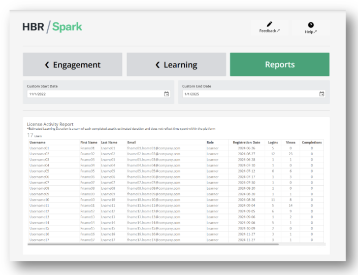 Gain insights into learner-level reporting for HBR Spark and see how your organization has engaged with the content.